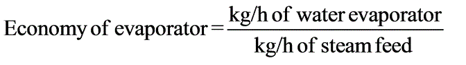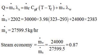 A solution with 10% solids is to be concentrated to 50% solids. Steam is available at a pressure of 0.20 MPa and a saturation temperature of 120oC. The feed rate to the evaporator is 30,000 kg/h at a temperature of 20oC. The evaporator operates at a reduced pressure where the boiling point is 50oC. The overall heat transfer coefficient is 2.9 kW / (M2 - K). What is the steam economy for this evaporation process?