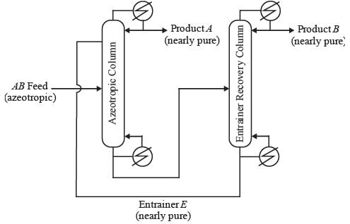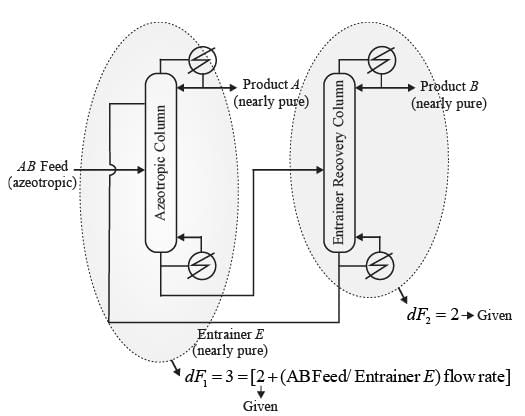 In a homogeneous azeotropic distillation setup, an azeotropic binary feed of components A and B is separated using a heavy entrainer, E, as illustrated in the figure. The amount of E lost in the two product streams is minimal, allowing E to circulate in a closed loop throughout the process. For a distillation column with fully specified feed(s) and defined operating pressure, where there is one distillate stream and one bottoms stream, the steady-state degrees of freedom is determined to be 2. In the process depicted in the figure, with a fully specified AB feed stream and given column operating pressures, the steady-state degrees of freedom is equal to