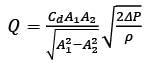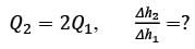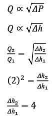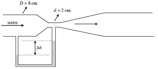 A Venturi meter, featuring a throat diameter of d = 2cm, is utilized to measure the flow rate in a pipe with a diameter of D = 6cm, as illustrated in the accompanying figure. A U-tube manometer is attached to gauge the pressure drop. Assume the discharge coefficient remains constant regardless of the Reynolds number and geometric ratios. If the volumetric flow rate in the pipe is increased to Q2 = 2Q1, what is the corresponding ratio of the manometer readings Δh2/Δh1, rounded to the nearest integer?