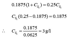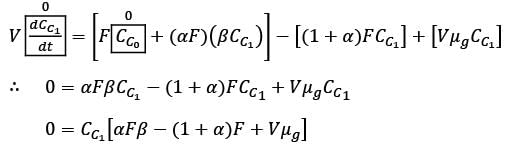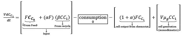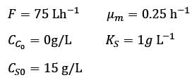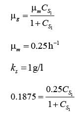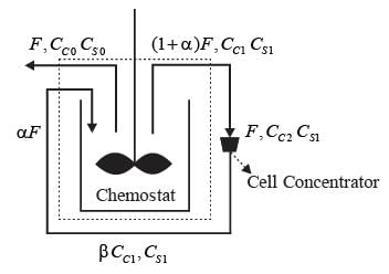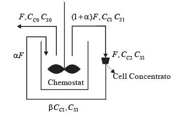 A chemostat with cell recycle is shown in the figure. The feed flow rate and culture volume are F = 75Lh-1 and V = 200L, respectively. The glucose concentration in the feed CS0 = 15gL-1. Assume Monod kinetics with specific cell growth rate where μm= 0.25h−1 and Ks = 1gL-1 . Assume maintenance and death rates to be zero, input feed to sterile (CC0 = 0) and steady-state operation. The glucose concentration in the recycle stream, CS1, in gL−1, rounded off to 1 decimal place, is _________.