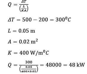 A metal slab with a thickness of 5 cm and a thermal conductivity of 400 Wm−1 °C−1 has its opposite faces kept at temperatures of 500°C and 200°C. Each face has an area of 0.02 m2. Assuming that heat transfer is steady and occurs solely in the direction perpendicular to the surfaces, what is the heat transfer rate, in kW, rounded to the nearest integer?
