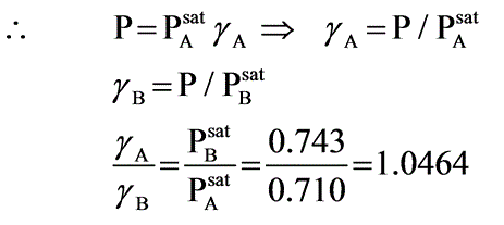 A binary mixture of components A and B creates an azeotrope with a boiling point of 71.8°C at a pressure of 1 bar, where the azeotropic composition consists of 55 mol percent of A. The saturated vapor pressures at 71.8°C are PA,sat = 0.710 bar and PB,sat = 0.743 bar. Assuming the vapor behaves ideally, what will be the ratio of the activity coefficients of A to B in the liquid phase?