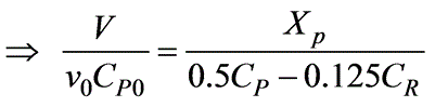 A reversible isothermal reaction in an aqueous phase, represented as P R, is to be conducted in a mixed flow reactor. The reaction rate, expressed in (kmol/m3 -h), is defined by -rP = 0.5CP - 0.125CR. A feed stream containing solely P is introduced into the reactor. What will be the residence time (in minutes) required for a 40% conversion of P?