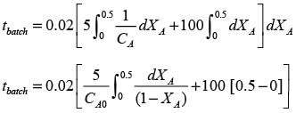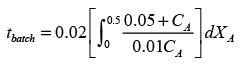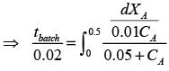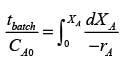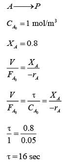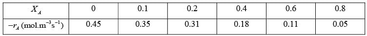 A → products, was conducted in an ideal batch reactor at a temperature T. The reaction rate (-rA) at various conversions XA is provided in the table below. This reaction was also performed in an ideal continuous stirred tank reactor (CSTR) at the same temperature T with a feed concentration of 1 mol.m-3, maintaining steady-state conditions. For a conversion of 0.8, what is the space time (in seconds) of the CSTR, expressed as an integer?