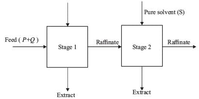 Two ideal counter-current stages are utilized to extract P from a feed that contains both P and Q, as illustrated below.