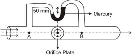 Oil is flowing through a pipe that has a diameter of 0.05 m, with the oil's density being 850 kg/m3. A differential manometer is connected to this pipe, and an orifice plate with a diameter of 0.025 m is inserted as illustrated in the figure.