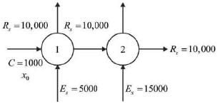 The mass flow rates of P and Q entering stage 1 are 1,000 kg h-1 and 10,000 kg h-1, respectively. Pure solvent (S) is introduced at mass flow rates of 5,000 kg h-1 and 15,000 kg h-1 to stages 1 and 2, respectively. The components Q and S do not mix. The equilibrium relationship is defined by Y* = 1.5X, where X represents the mass of P per unit mass of Q in the raffinate, and Y* denotes the mass of P per unit mass of S in the extract that is in equilibrium with the raffinate. The mass flow rate of P (in kg h-1) in the raffinate from state 2 is ____(round off to nearest integer).