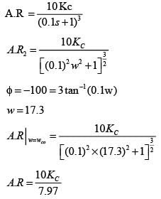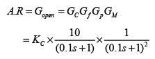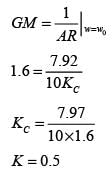 Gc, Gf, and Gp represent the transfer functions of the controller, the final control element, and the process, respectively. y and ysp denote the response and its set point, respectively. Given a gain margin of 1.6, what is the design value of KC _____ (rounded to one decimal place)?