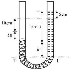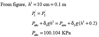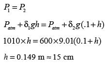A U-tube manometer is filled with two different manometric fluids, having densities of 1000 kg m−3 and 600 kg m−3. When both arms of the manometer are open to the atmosphere, the height difference between the two fluid levels is 10 cm at equilibrium, as illustrated in the figure.