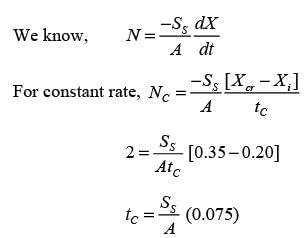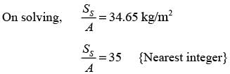 In an experiment involving batch drying, a solid with a critical moisture content of 0.2 kg H2O/kg dry solid is reduced from an initial moisture content of 0.35 kg H2O/kg dry solid to a final moisture content of 0.1 kg H2O/kg dry solid over a period of 5 hours. During the constant rate phase, the drying rate is 2 kg H2O/(m2h). The entire falling rate phase is assumed to follow a uniformly linear pattern. The equilibrium moisture content is considered to be zero. What is the mass of the dry solid per unit area in kg/m2? (round off to the nearest integer)