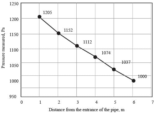 Water with a density of 1000 kg m−3 flows through a horizontal pipe that has a diameter of 10 cm, moving at an average speed of 0.5 ms−1. The following graph illustrates the pressure readings taken at various points along the pipe from its entrance.