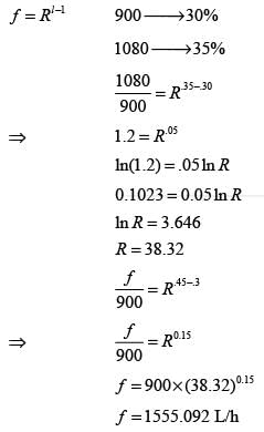 The flow rate of water through an equal percentage valve is 900 liters h-1 when the valve is opened to 30%, and 1080 liters h-1 at a 35% opening. Assuming that the pressure drop across the valve remains unchanged, what is the flow rate (in liters h-1) through the valve at a 45% opening? Please round your answer to the nearest integer.