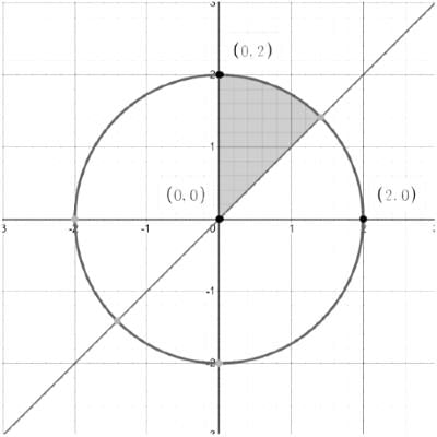 x2 y2 = 4, the line y = x, and the vertical axis.