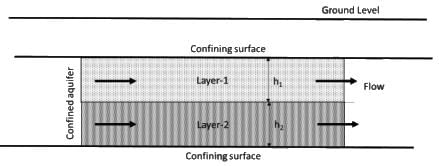 Consider two horizontal layers of an aquifer as shown in the diagram. Each layer is both isotropic and homogeneous. The flow occurs parallel to the layers. The thickness and horizontal hydraulic conductivity of the first layer are represented as h1 and K1, respectively. For the second layer, the thickness and horizontal hydraulic conductivity are indicated by h2 and K2, respectively, under the condition that h1 does not equal h2.