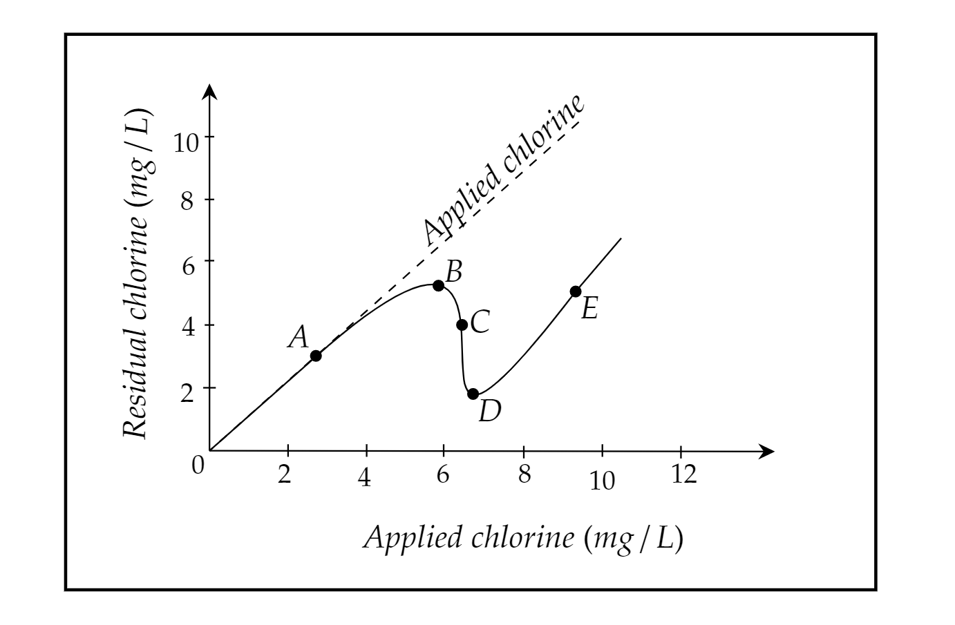 'Point D' represents the breakpoint. As seen, up to B - Chlorine is required to destroy both bacteria and organic impurities. So, when chlorine is applied, it first kills the bacteria up to 'B'. Further addition of Cl2 (Chlorine) appears as residual chlorine. Up to point 'C' the chlorine is used for oxidizing the impurities. At point 'D' the residual chlorine increases as all the demands of impurities and bacteria are satisfied. So, this point 'D' is called the "Breakpoint". Now, as there is no component left in the water that will react with added chlorine, so after a breakpoint, any further dose of chlorine gets accumulated and this process of adding chlorine beyond the breakpoint is called "Breakpoint chlorination".