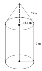 A circus tent has a cylindrical section that rises to a height of 3 m, topped by a conical section. The diameter of the tent measures 105 m, and the slant height of the cone is 53 m. Determine the total area of canvas needed.