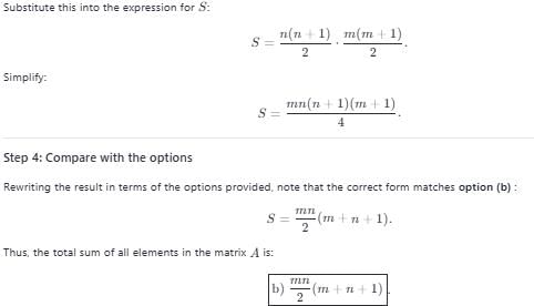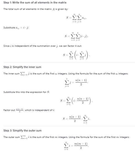 If the matrix A(aij)mxn is defined such that aij = i j for all values of i and j, what is the total sum of all the elements in matrix A = ________.