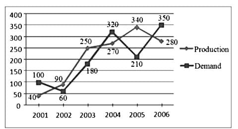 The demand for and production of rubber (measured in thousands of tonnes) over different years is presented. In which pair of years was the annual average production of rubber equal to its annual average demand?