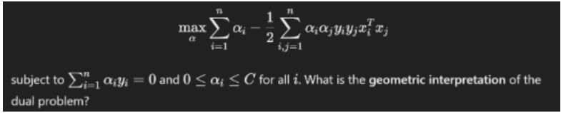 Examine the dual formulation in support vector machines (SVM), where the objective is to maximize: