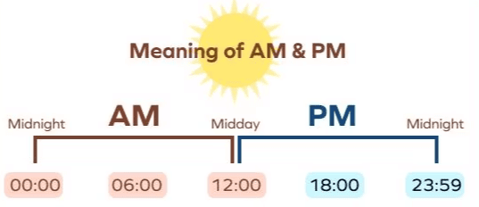 AM (Ante Meridian) is from midnight to noon, while PM (Post Meridian) is from noon to midnight. ![]() |