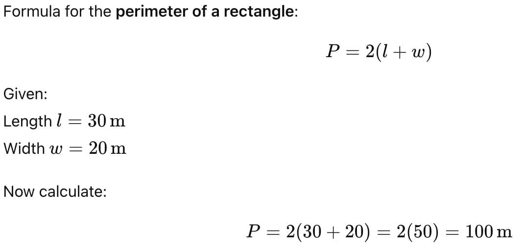The perimeter of a square is calculated as 4 × side length. Therefore, for a square with a side length of 40 meters, the perimeter is 4 × 40 m = 160 meters. | Card: 40 / 40 |