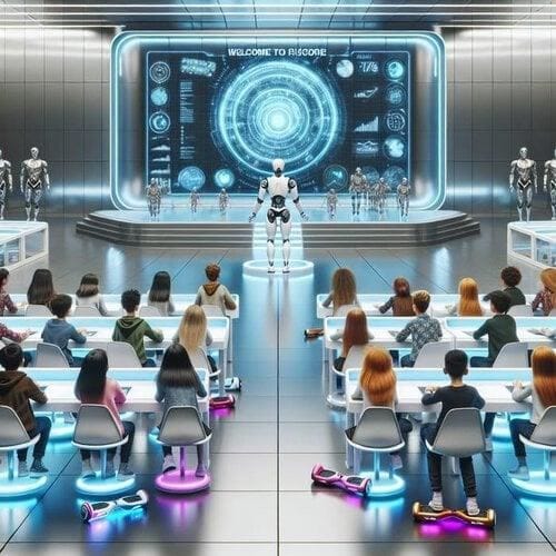 False. Schools have changed completely, with robotic teachers replacing human instructors. | Card: 6 / 22 |