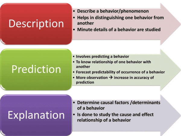 The primary goals of psychological enquiry are description, prediction, explanation, control of behavior, and application of knowledge. |