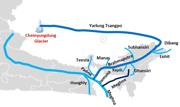 True or False: The Brahmaputra river flows from southwest to northeast before entering Bangladesh. |