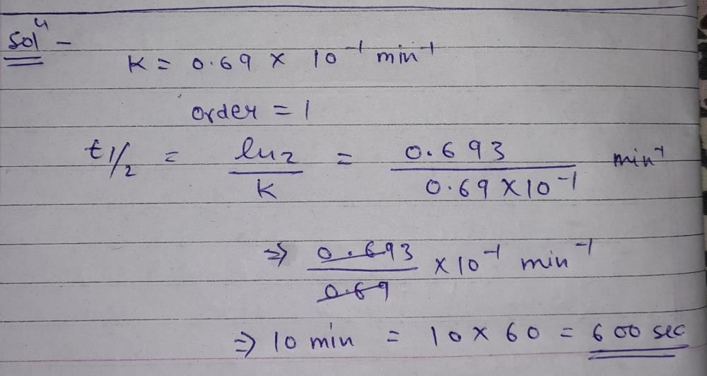 The rate constant of reaction is 0.69/10 /min and initial concentration is 0.2 M/L. The half life period is. A) 400sec B)600sec C)800sec D)12oo sec?