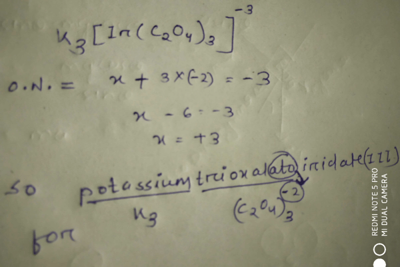 Potassium trioxalatoirididate (lll). Since, oxidation state of coordination entity is negative, so suffux -ate is used and oxidation number of iridium metal is +3 because oxalate has a charge of -2.