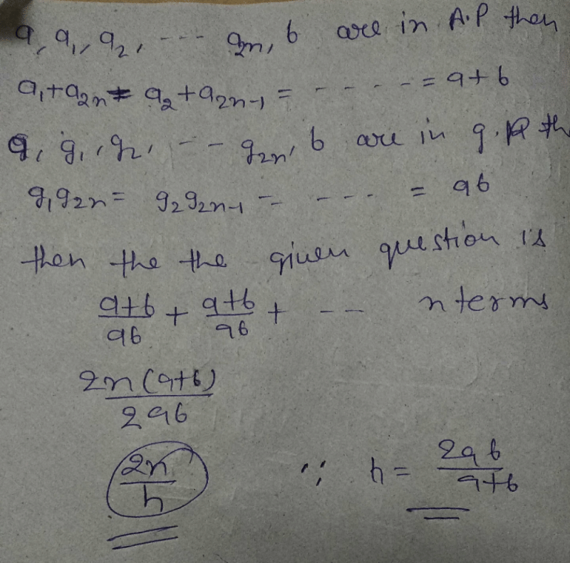 Find important definitions, questions, meanings, examples, exercises and tests below for If a, a1, a2, a3, a4, ......, a2n, b are in AP and a, g1, g2, g3, g4,........g2n, b are in GP and h is the HM of a and b thenis equal toa)2n/hb)2nhc)nhd)n/hCorrect answer is option 'A'. Can you explain this answer?.
