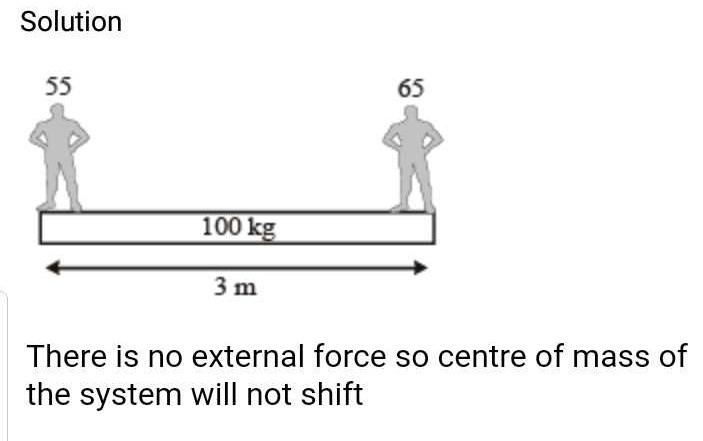 Two persons of masses 55 kg and 65 kg respectively, are at the opposite ends of a boat.The length of the boat is 3.0 m and weighs 100 kg. The 55 kg man walks up to the 65 kg man and sits with him. If the boat is in still water the centre of mass of the system shifts by : [2012]a)3.0 mb)2.3 mc)zerod)0.75 mCorrect answer is option 'C'. Can you explain this answer?, a detailed solution for Two persons of masses 55 kg and 65 kg respectively, are at the opposite ends of a boat.The length of the boat is 3.0 m and weighs 100 kg. The 55 kg man walks up to the 65 kg man and sits with him. If the boat is in still water the centre of mass of the system shifts by : [2012]a)3.0 mb)2.3 mc)zerod)0.75 mCorrect answer is option 'C'. Can you explain this answer? has been provided alongside types of Two persons of masses 55 kg and 65 kg respectively, are at the opposite ends of a boat.The length of the boat is 3.0 m and weighs 100 kg. The 55 kg man walks up to the 65 kg man and sits with him. If the boat is in still water the centre of mass of the system shifts by : [2012]a)3.0 mb)2.3 mc)zerod)0.75 mCorrect answer is option 'C'. Can you explain this answer? theory, EduRev gives you an