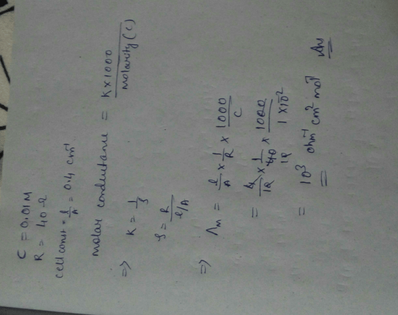 If 0.01 M solution of an electrolyte has a resistance of 40 ohms in a cell having a cell constant of 0.4 cm–1, then its molar conductance in ohm–1 cm2 mol–1 is [1997]a)102b)104c)10d)103Correct answer is option 'D'. Can you explain this answer?, a detailed solution for If 0.01 M solution of an electrolyte has a resistance of 40 ohms in a cell having a cell constant of 0.4 cm–1, then its molar conductance in ohm–1 cm2 mol–1 is [1997]a)102b)104c)10d)103Correct answer is option 'D'. Can you explain this answer? has been provided alongside types of If 0.01 M solution of an electrolyte has a resistance of 40 ohms in a cell having a cell constant of 0.4 cm–1, then its molar conductance in ohm–1 cm2 mol–1 is [1997]a)102b)104c)10d)103Correct answer is option 'D'. Can you explain this answer? theory, EduRev gives you an