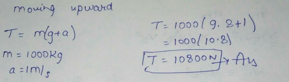 A lift weighing 1000 kg is moving upwards with an accelertion of 1 m/s...