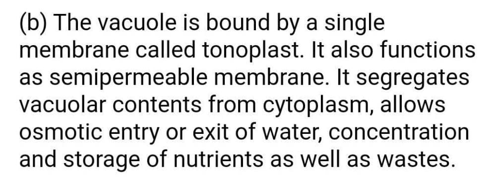 (b) The vacuole is bound by a single membrane called tonoplast. It also functions as semipermeable membrane. It segregates vacuolar contents from cytoplasm, allows osmotic entry or exit of water, concentration and storage of nutrients as well as wastes.