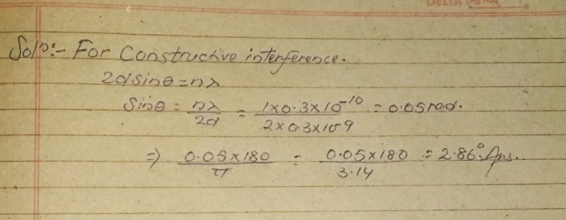 The distance between two successive atomic planes of a calcite crystal is .3nm.the maximum angle for Bragg's scattering of .3angstrom X-rays will be a)1.43deg b)1.56deg c)2.86deg d)30deg Correct option is c can you explain this?