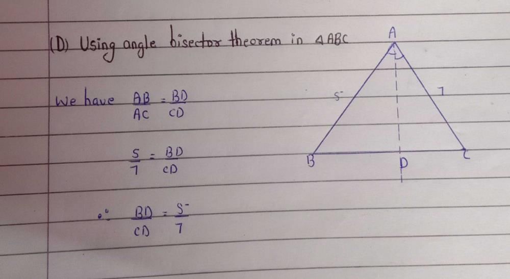 In ΔABC, AB = 5 cm, AC = 7 cm. If AD is the angle bisector of ∠A. Then BD : CD is:a)25 : 49b)49 : 25c)6 : 1d)5 : 7Correct answer is option 'D'. Can you explain this answer?, a detailed solution for In ΔABC, AB = 5 cm, AC = 7 cm. If AD is the angle bisector of ∠A. Then BD : CD is:a)25 : 49b)49 : 25c)6 : 1d)5 : 7Correct answer is option 'D'. Can you explain this answer? has been provided alongside types of In ΔABC, AB = 5 cm, AC = 7 cm. If AD is the angle bisector of ∠A. Then BD : CD is:a)25 : 49b)49 : 25c)6 : 1d)5 : 7Correct answer is option 'D'. Can you explain this answer? theory, EduRev gives you an