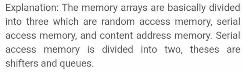Explanation: The memory arrays are basically divided into three which are random access memory, serial access memory, and content address memory. Serial access memory is divided into two, theses are shifters and queues.