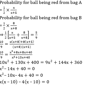 Find important definitions, questions, meanings, examples, exercises and tests below for There are two bags A and B. Bag A contains 5 blue balls and x red balls and bag B contains x blue balls and 8 red balls. If one ball is chosen at random from any one bag, then the probability that it is a red ball is 5/9. Find ‘x’a)10b)4c)3d)5e)both (A) and (B)Correct answer is option 'E'. Can you explain this answer?.