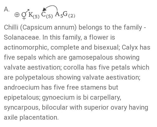 - G: Represents the gynoecium or the female reproductive part. Chilli flowers have a bicarpellate (two-carpel) ovary, hence G(2).