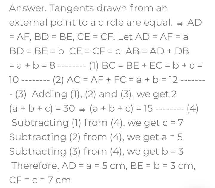 the Class 10 exam syllabus. Information about A circle is inscribed inΔABC having sides 8 cm, 10 cm and 12 cm as shown in the figure. Then,a)AD = 7 cm, BE = 5 cm.b)AD = 8 cm, BE = 5 cm.c)AD = 8 cm, BE = 6 cm.d)AD = 5 cm, BE = 7 cm.Correct answer is option 'A'. Can you explain this answer? covers all topics & solutions for Class 10 2025 Exam.