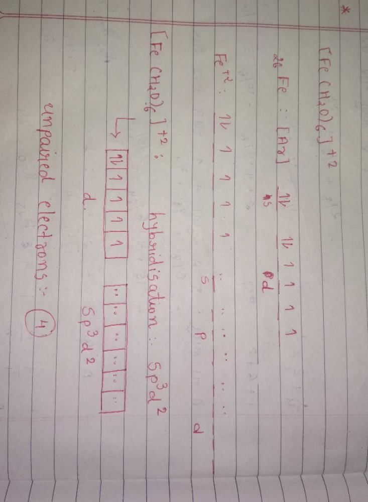 The hybridisation and unpaired electrons in [Fe(H2O)6]2+ion are :a)sp3...