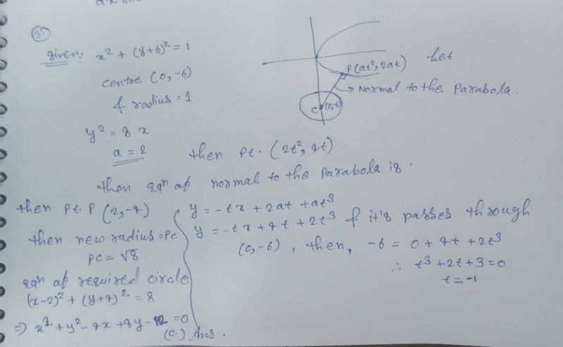 Find important definitions, questions, meanings, examples, exercises and tests below for Let P be the point on the parabola, y2 = 8x which is at a minimum distance from the centre C of the circle, x2 + (y + 6)2 = 1.Then the equation of the circle, passing through C and having its centre at P is: [JEE M 2016]a)b)x2 + y2 – 4x + 9y + 18 = 0c)x2 + y2 – 4x + 8y + 12 = 0d)x2 + y2 – x + 4y – 12 = 0Correct answer is option 'C'. Can you explain this answer?.
