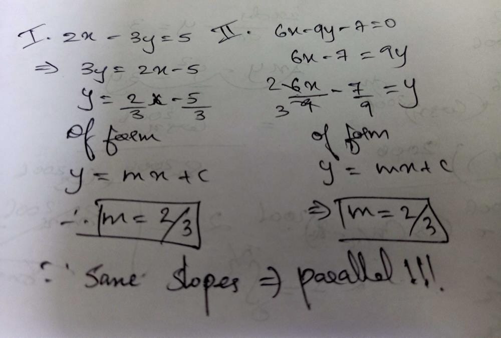 Here you can find the meaning of The lines 2x – 3y = 5 and 6x – 9y – 7 = 0 area)parallelb)coincidentc)perpendiculard)none of theseCorrect answer is option 'A'. Can you explain this answer? defined & explained in the simplest way possible. Besides giving the explanation of The lines 2x – 3y = 5 and 6x – 9y – 7 = 0 area)parallelb)coincidentc)perpendiculard)none of theseCorrect answer is option 'A'. Can you explain this answer?, a detailed solution for The lines 2x – 3y = 5 and 6x – 9y – 7 = 0 area)parallelb)coincidentc)perpendiculard)none of theseCorrect answer is option 'A'. Can you explain this answer? has been provided alongside types of The lines 2x – 3y = 5 and 6x – 9y – 7 = 0 area)parallelb)coincidentc)perpendiculard)none of theseCorrect answer is option 'A'. Can you explain this answer? theory, EduRev gives you an ample number of questions to practice The lines 2x – 3y = 5 and 6x – 9y – 7 = 0 area)parallelb)coincidentc)perpendiculard)none of theseCorrect answer is option 'A'. Can you explain this answer? tests, examples and also practice JEE tests.
