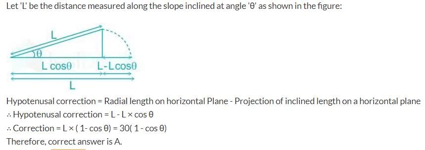 The correction to be applied to each 30 metre chain length along θ° slope, isa)30 (cosθ - 1)mb)30 (sinθ- 1)mc)30 (secθ - 1)m,d)30 (tanθ - 1)mCorrect answer is option 'A'. Can you explain this answer?, a detailed solution for The correction to be applied to each 30 metre chain length along θ° slope, isa)30 (cosθ - 1)mb)30 (sinθ- 1)mc)30 (secθ - 1)m,d)30 (tanθ - 1)mCorrect answer is option 'A'. Can you explain this answer? has been provided alongside types of The correction to be applied to each 30 metre chain length along θ° slope, isa)30 (cosθ - 1)mb)30 (sinθ- 1)mc)30 (secθ - 1)m,d)30 (tanθ - 1)mCorrect answer is option 'A'. Can you explain this answer? theory, EduRev gives you an