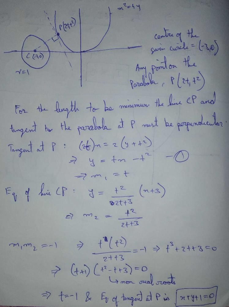 Let P be a point on the parabola, x2 = 4y. If the distance of P from the centre of the circle, x2 + y2 + 6x + 8 = 0 is minimum, then the equation of the tangent to the parabola at P, is :a)x + y + 1 = 0b)x + 4y – 2 = 0c)x + 2y = 0d)x – y + 3 = 0Correct answer is option 'A'. Can you explain this answer?, a detailed solution for Let P be a point on the parabola, x2 = 4y. If the distance of P from the centre of the circle, x2 + y2 + 6x + 8 = 0 is minimum, then the equation of the tangent to the parabola at P, is :a)x + y + 1 = 0b)x + 4y – 2 = 0c)x + 2y = 0d)x – y + 3 = 0Correct answer is option 'A'. Can you explain this answer? has been provided alongside types of Let P be a point on the parabola, x2 = 4y. If the distance of P from the centre of the circle, x2 + y2 + 6x + 8 = 0 is minimum, then the equation of the tangent to the parabola at P, is :a)x + y + 1 = 0b)x + 4y – 2 = 0c)x + 2y = 0d)x – y + 3 = 0Correct answer is option 'A'. Can you explain this answer? theory, EduRev gives you an