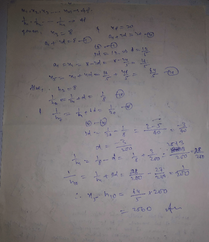 Find important definitions, questions, meanings, examples, exercises and tests below for If x1 , x2 … . , xn and 1/h1,1/h2......1/hnare two A. P. s such that x3 = h2 = 8 and x8 = h7 = 20 , thenx5 . h10 equals:a)2650b)2560c)3200d)1600Correct answer is option 'B'. Can you explain this answer?.