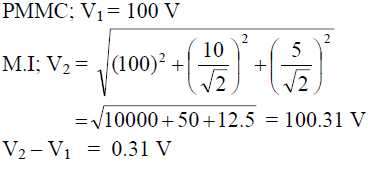 Find important definitions, questions, meanings, examples, exercises and tests below for A dc voltage with ripple is given by v(t) = [100+10sin(ωt) -5sin(3ωt)] volts. Measurements of this voltage v(t), made by moving-coil and moving iron voltmeters, show readings of V1 and V2 resplectively. The value of V2-V1, in volts, is ___________.Correct answer is '0.31'. Can you explain this answer?.