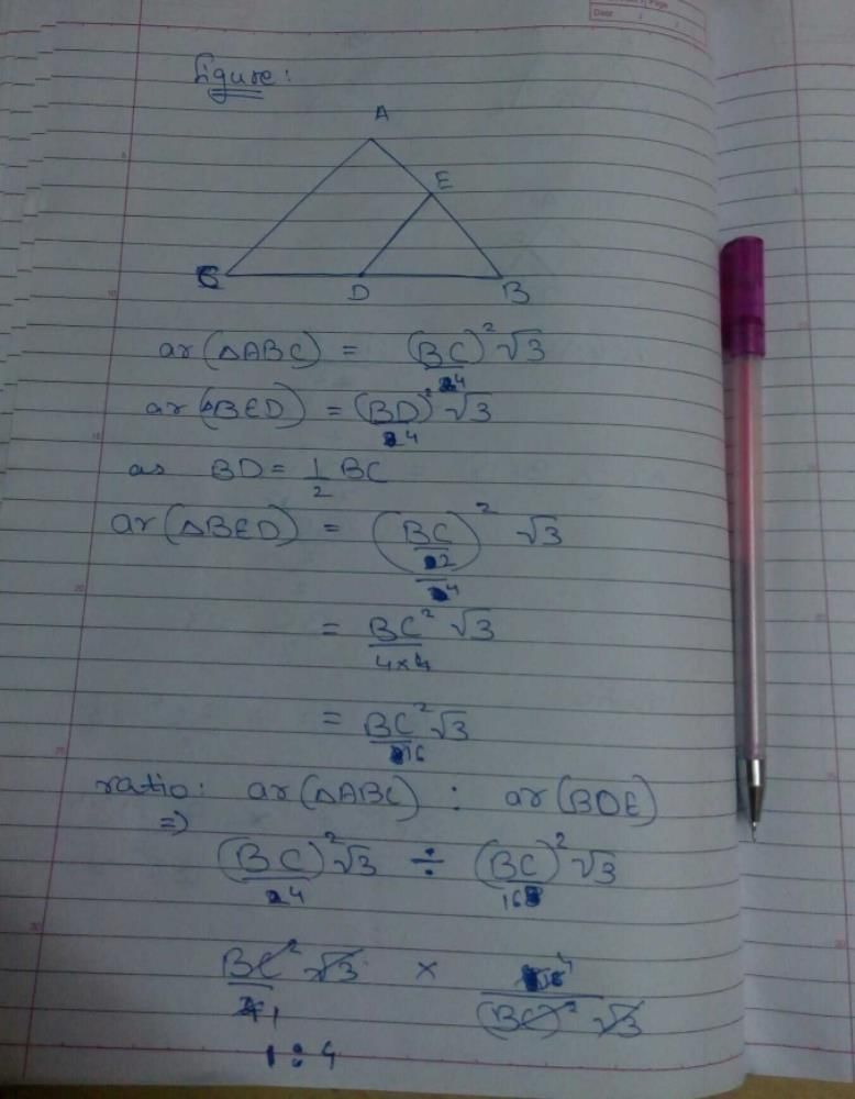 ABC and BDE are two equilateral triangles such that D is mid-point of BC. Ratio of the areas of triangles ABC and BDE is