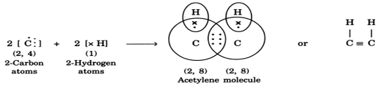 (ii) Formation of acetylene molecule (C2H2): In acetylene molecule, each carbon atom satisfies its valency by sharing one electron with a hydrogen atom and sharing the other three electrons with the other carbon atom as shown: